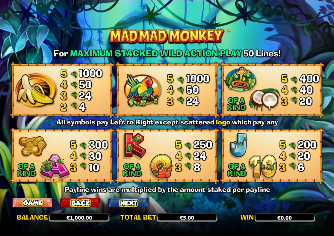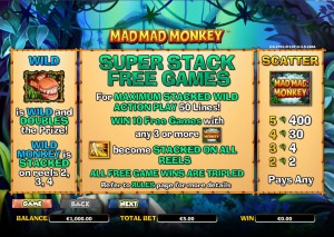 50 paylines are available in Mad Mad Monkey, and for this to happen the 5 reels can each accommodate 4 symbols. Super Stack free spins, multipliers, scatters and stacked wilds are used by the slot, while offering payouts of $4,000.