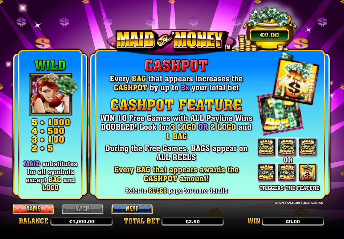 Maid o Money will give you wild symbols, a Cashpot feature with free spins and multipliers, plus some scatter symbols.