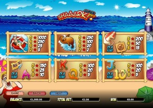 There are two possible background pictures you can get in this slot. One is in base game mode, where you see the beach, the ocean and a lighthouse. The other is in SuperBet mode, where you’re looking at the bottom of the ocean, with plants below and fish swimming around the reels. On the reels, the images don’t change, being the same mix of shark bitten poker cards and images of danger signs, bitten surfboards, seals and so on.