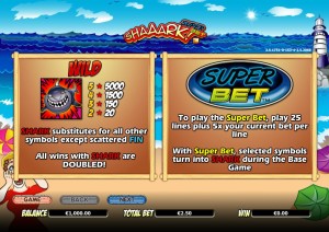 Activating the SuperBet is easy enough. All you have to do is click once on the SuperBet button which is located in the middle of the betting options. This will add an additional 5 coins to the wager, on top of the 25 used to cover the regular lines. What this feature will do for you is related to the wild symbols, as it adds additional ones on the reels. Certain symbols will become Sharks while you’re in the base game, improving your chances of getting some new combo going.
