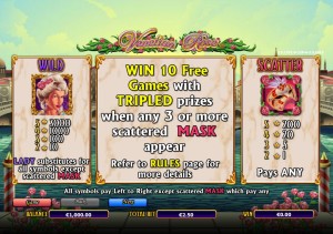 The Mask is the scatter symbol in Venetian Rose, a symbol which is not required to form regular combinations. The symbols can be anywhere and they will still contribute to payouts of up to 200 times the bet and to the start of the free spins.