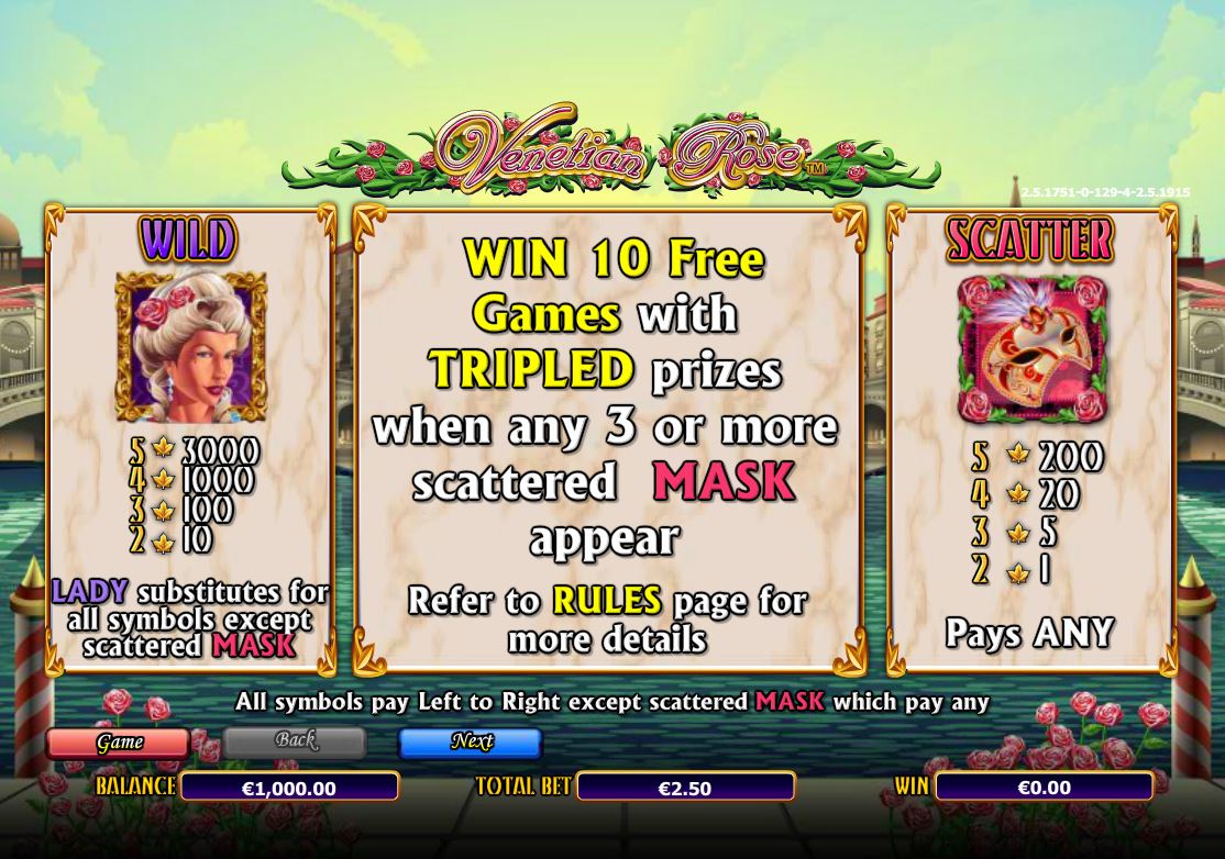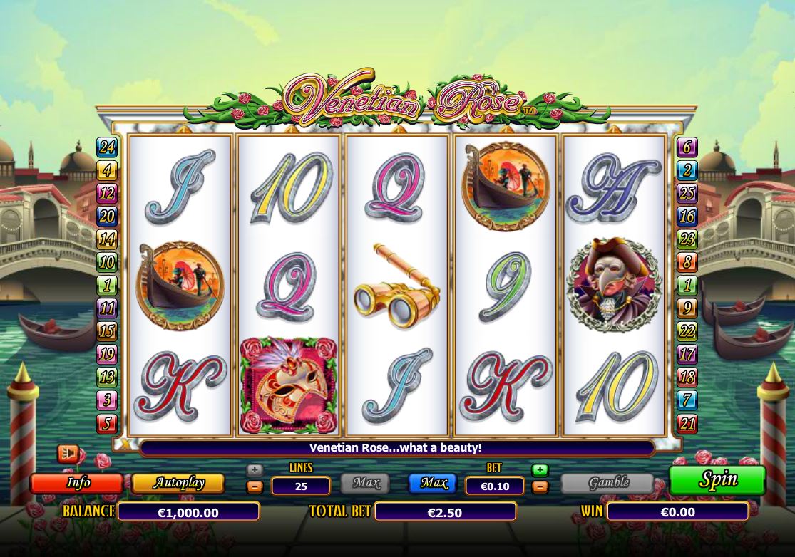 Venetian Rose seems to be standard in most ways, combining the 5 reels/25 lines of the layout with the features that include free games, multipliers, scatters and wilds. The prize is below average though, worth only $6,000.