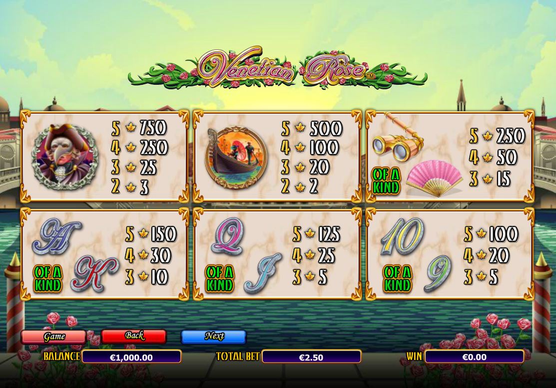 A betting range that goes from $0.01 to $50 is allowed in Venetian Rose. It uses 1 to 25 coins, each one having a value that only goes from $0.01 to $2.