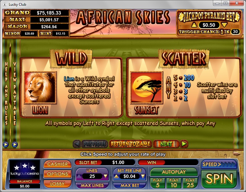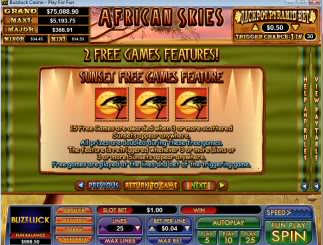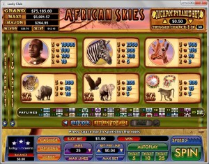 African Skies is a game which doesn’t feel too different from others, having a combination of 5 reels with 25 lines which a lot of slots offer. There is also a $10,000 jackpot inside, along with its two types of free spins, with multipliers, scatters and wilds.