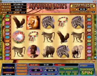 African Skies is one of the slot machines which Nuworks has released, a game with a theme that might be quite common, but which also has some very cool features that you can take advantage of. The game’s graphics and progressive jackpots are another two very good reasons to at least give it a chance. The images shown on the reels are mostly with African wildlife, so you understand why I said that it’s a common theme.