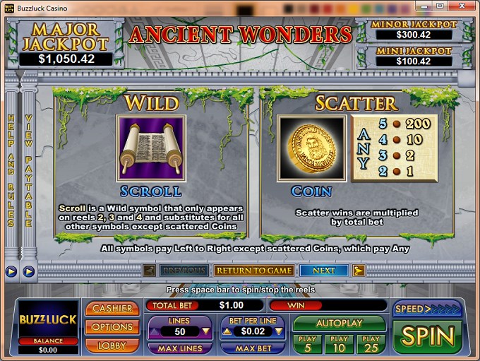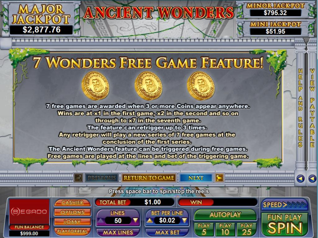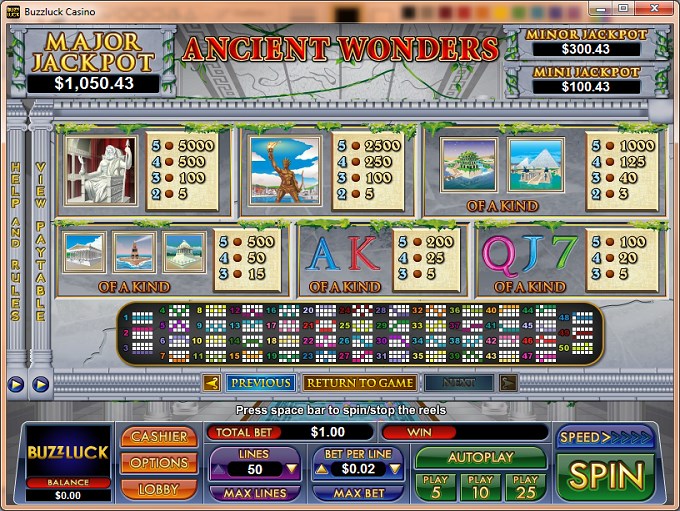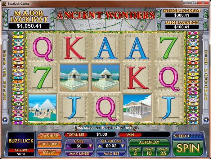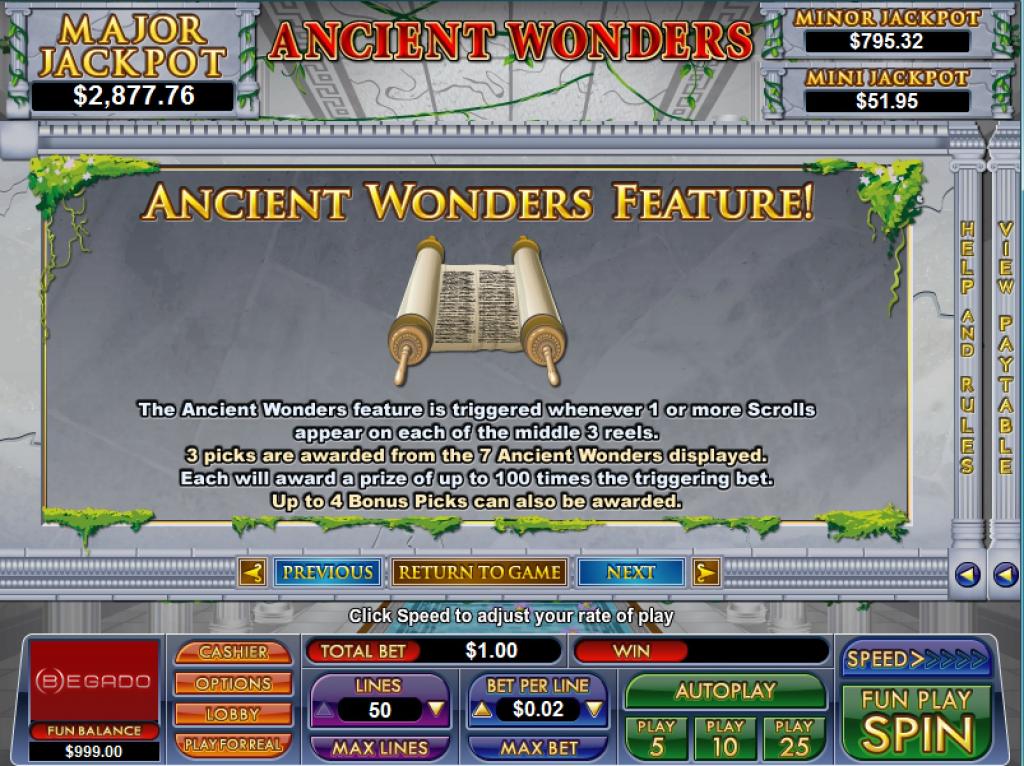 You’re going to get plenty of chances to win prizes in Ancient Wonders, as it has 50 lines that can have wins for you each round. Free spins, scatter symbols, bonus games, multipliers and wilds, these are the main features. As for the prizes, they give you up to $5,000, or one of the progressive jackpots.