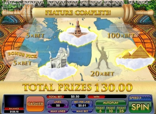 A new screen will load, with a map on which you can see the 7 Ancient Wonders displayed. You make picks there, 3 of them being possible, and up to 100x the bet is awarded to you each time you do this. You can also win up to 4 additional bonus picks.