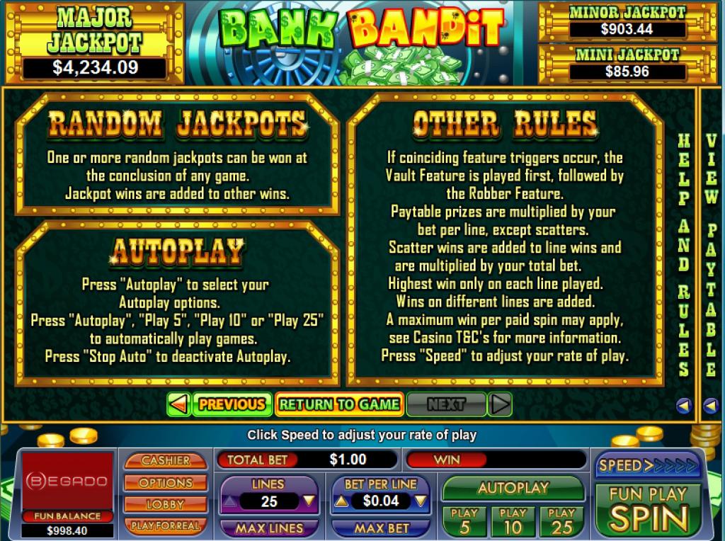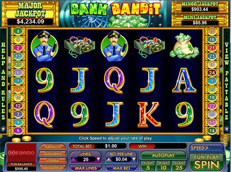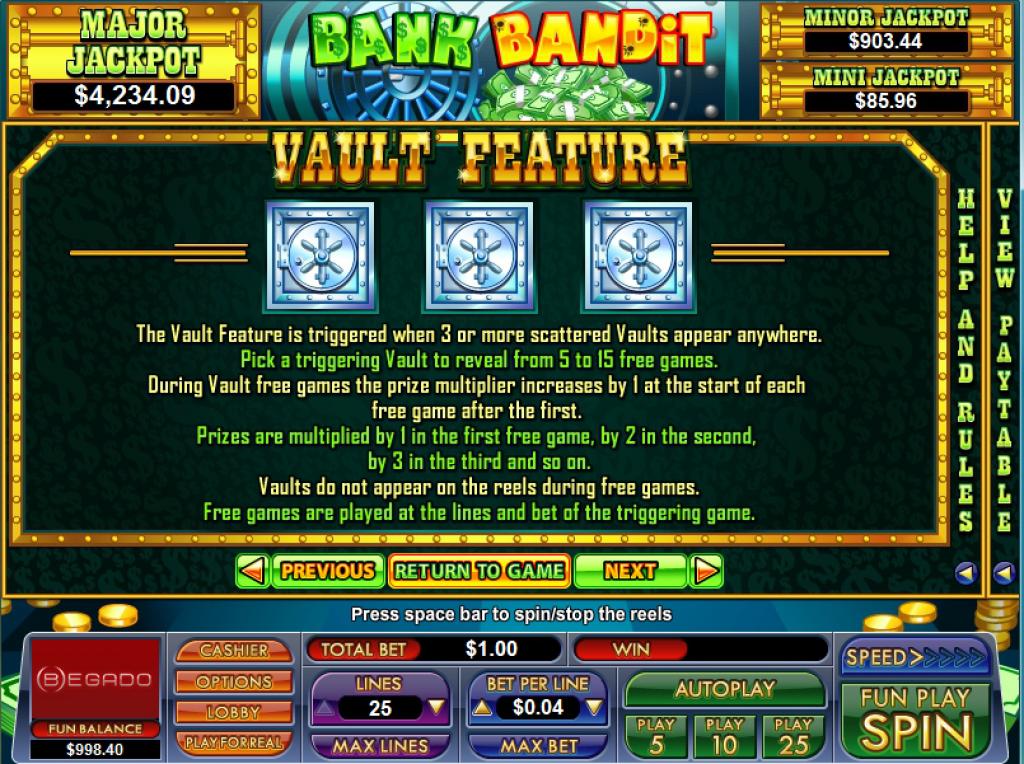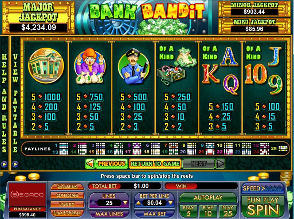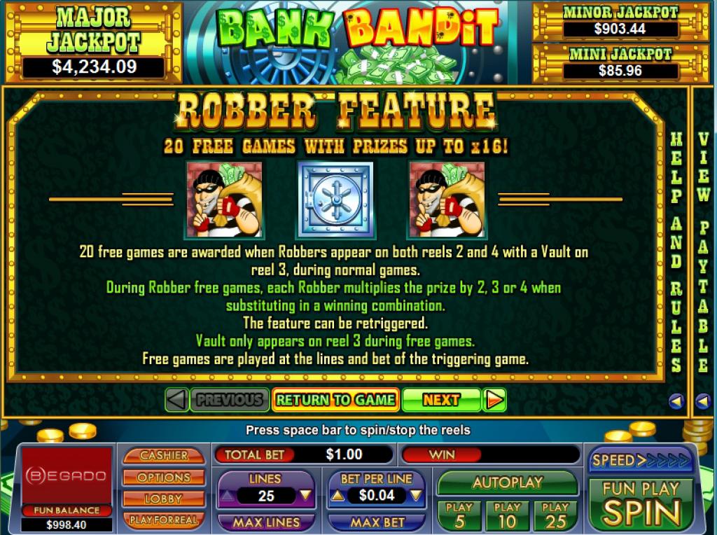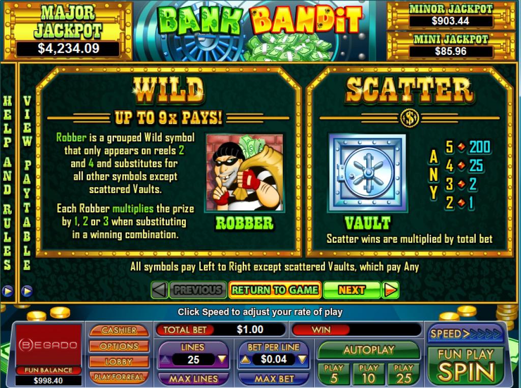 5 reels are used by Bank Bandit, and they are hosts for 25 bet lines. There are some very cool features inside, especially the stacked wilds which combine multipliers and give you up to 9x the usual prizes, but also the scatters and the free spins. Winning up to $9,000 is possible in the base game.
