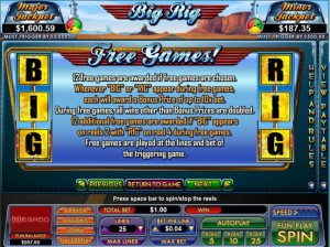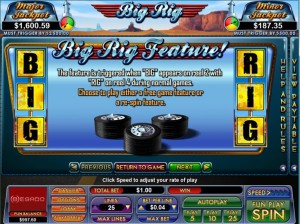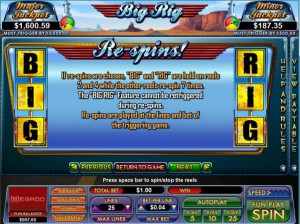 To trigger the bonus game of Big Rig, the requirement is for both stacked wilds to be visible on the reels on which they can appear (2nd and 4th). When this happens, you get a choice, to play either the feature with re-spins, or the one with free spins.