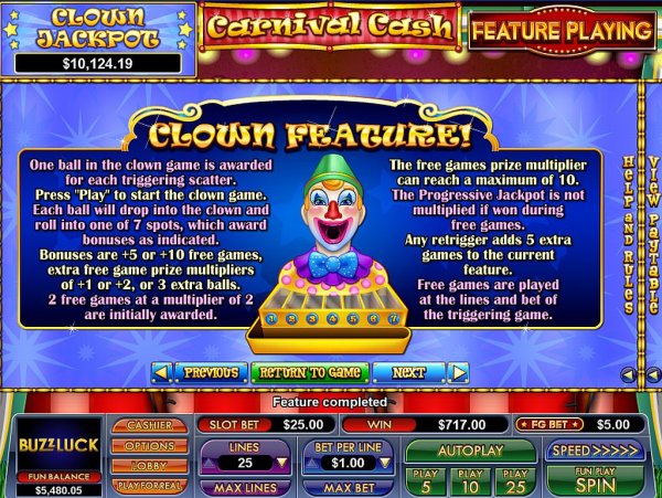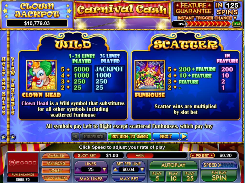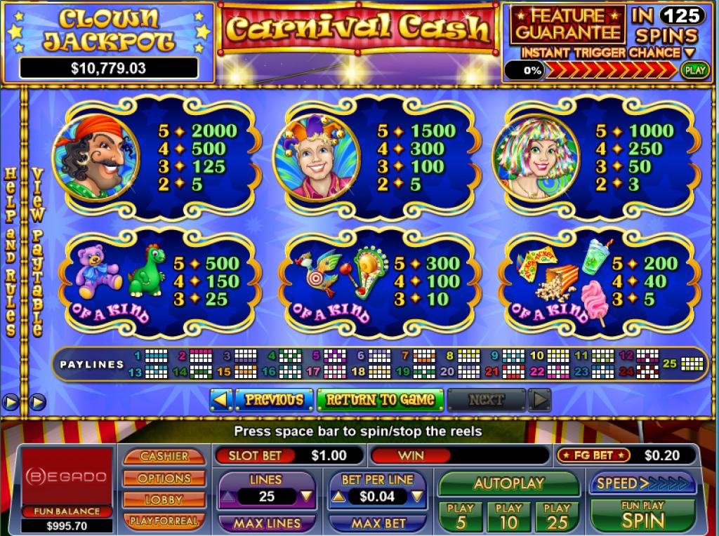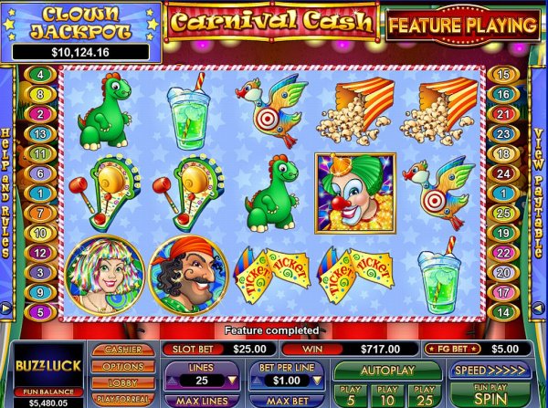 The 5 reels of Carnival Cash offer the player 25 paylines that wagers can be placed on, the result being payouts of up to $5,000 and the appearance of features that include wild symbols, bonus games, multipliers, free games and scatters.