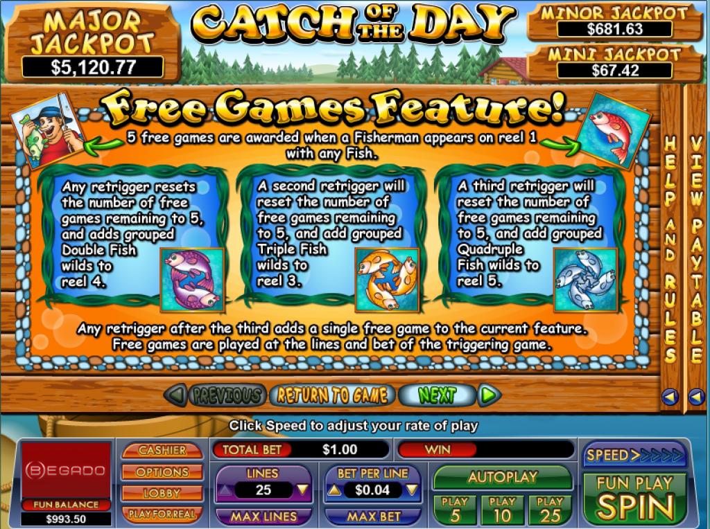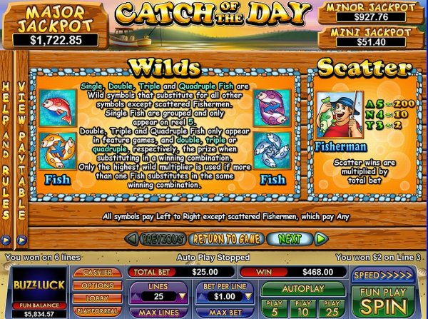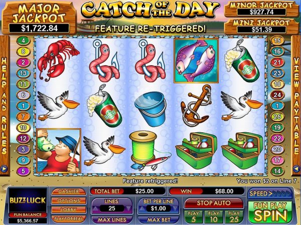 A fishing themed game with 5 reels/25 bet lines, Catch Of The Day gives you payouts of up to $5,000 and as its features there are multiple types of stacked wilds, multipliers, free games and scatters.