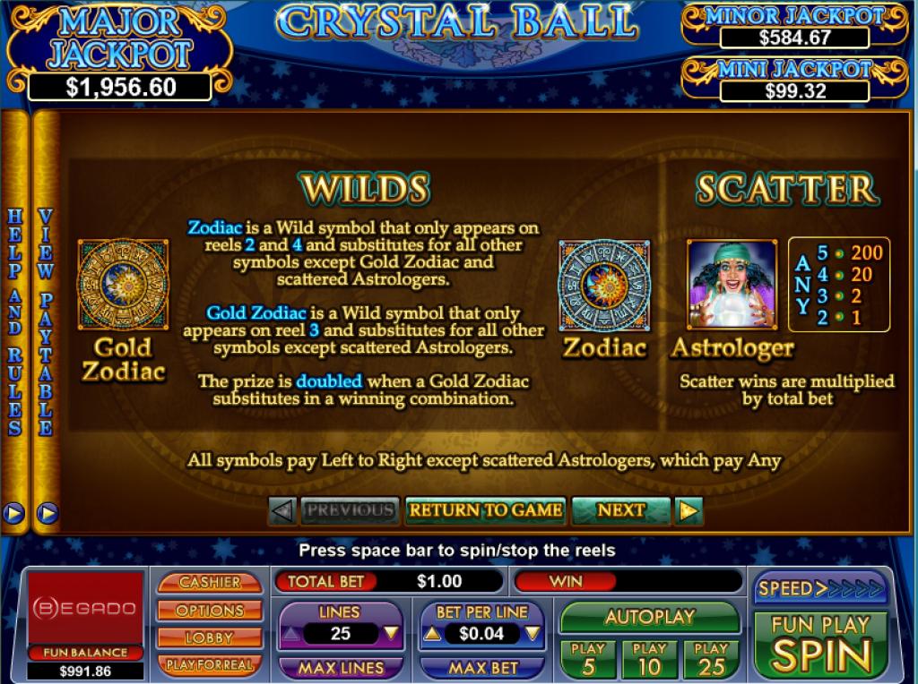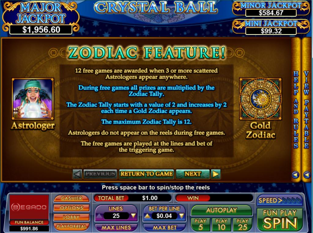 Crystal Ball is the right game to play if you’re a believer in Astrology, in the zodiac and in the possibility that someone can read your future by looking in a crystal ball. Or, it can simply be a good way to unwind, even if you’re not a huge believer in such things. Designed by Nuworks, Crystal Ball has a number of brothers with similar themes that were created by other developers, so it seems like there is a market for such titles.