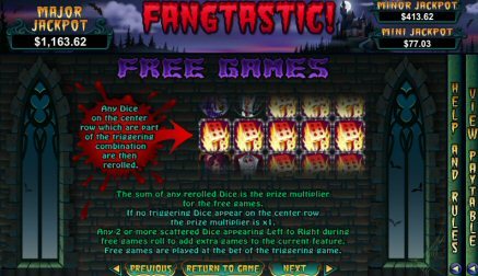 Getting into the free spins mode is easy enough, the game requiring that at least two Dice scatters appear on the reels. All the dice roll once, and they give you a number of spins which is equal to the sum of the numbers shown by the dice. Up to 66 free spins can be won.