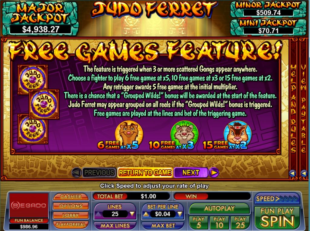 The free spins of Judo Ferret will offer you free spins at varying multipliers. You decide which of the three options you take, but first you need a minimum of three Gong scatters to get the feature going.