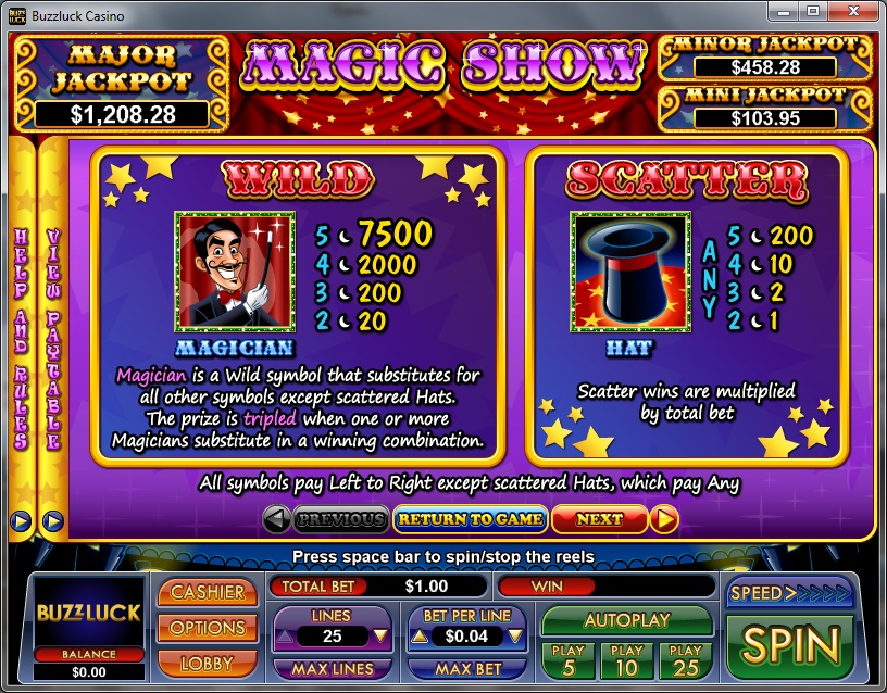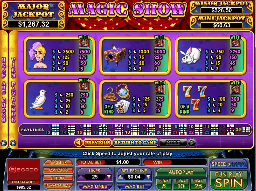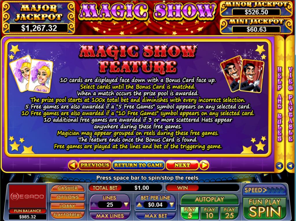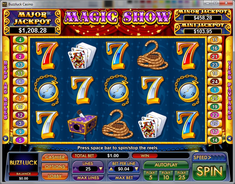 Magic Show’s offer will put up to $7,500 in front of you, provided that you got the right five symbols on one of the 25 paylines. You can also get scatter symbols, wilds, bonus games and free spins with 5x multipliers.