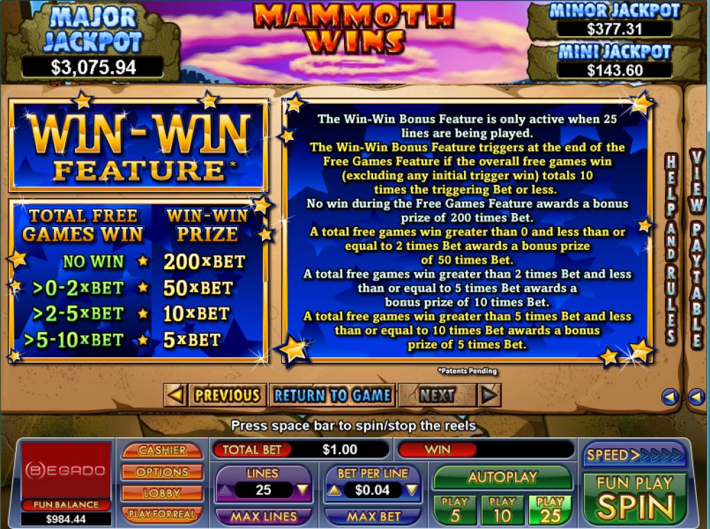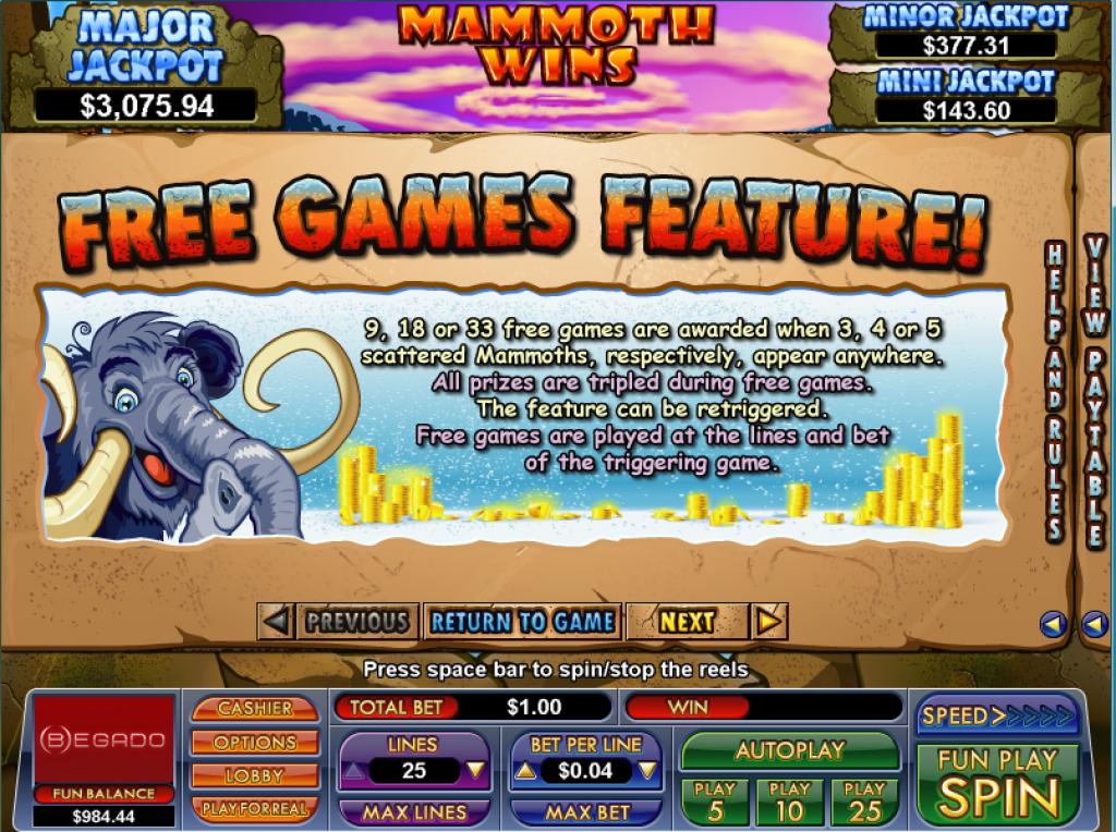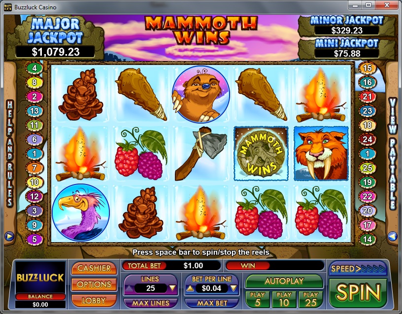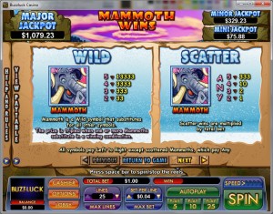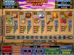 Once the 5 reels of Mammoth Wins are spinning, the symbols which appear will get a chance to form their combinations on a maximum of 25 bet lines. You might also encounter scatter symbols, wilds, free games and some multipliers. Prizes of $13,333 are won inside, with the right combo of icons.