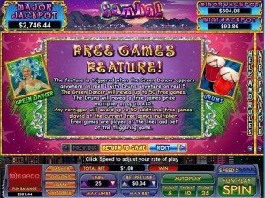 With this feature, the player gets free spins, up to 50 of them. The requirement is for the Green Dancer to be on the 1st reel, while at the same time you have a Drums scatter on the 5th. You get the number of free spins from the wild, while the scatter shows you what multiplier will be used, the maximum being 10x.