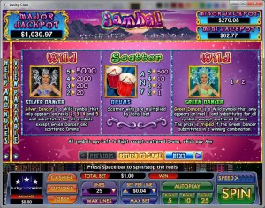 The two wilds that the game has in store for you are represented by the dancers dressed in Silver and Green costumes. While the Silver Dancer is reserved for the reels 2 to 5, the Green Dancer appears only on reel 1. Both wilds can substitute for regular symbols. The Silver Dancer can’t replace a Green Dancer or a scatter. The Green Dancer can’t substitute for the scatter, but can take the place of a Silver Dancer if this results in a combo forming. If you have a combo formed out of one Green Dancer (1st reel) and four Silver Dancers (reels 2 to 5), then you get paid 5,000 coins.