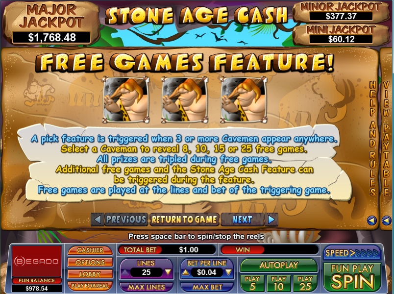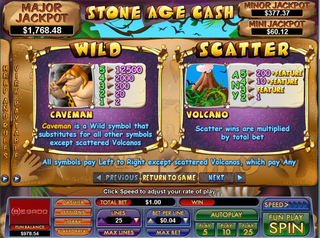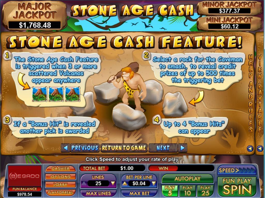 The Stone Age Cash features start with the Caveman wild, then the scattered Volcano, free spins with multipliers and a bonus game.
