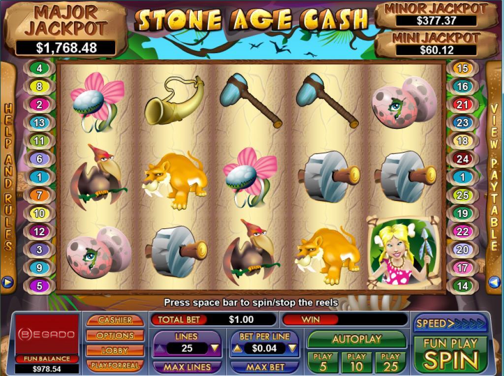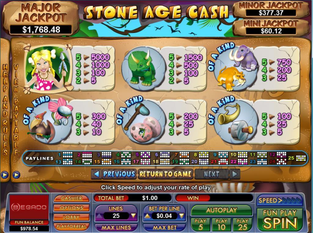 Like most slots offered by Nuworks, Stone Age Cash offers the same 5 reels/25 bet lines. There are wild symbols inside, along with scatters, a bonus game and free spins with multipliers. You can win $12,500 cash, if you get the top jackpot.