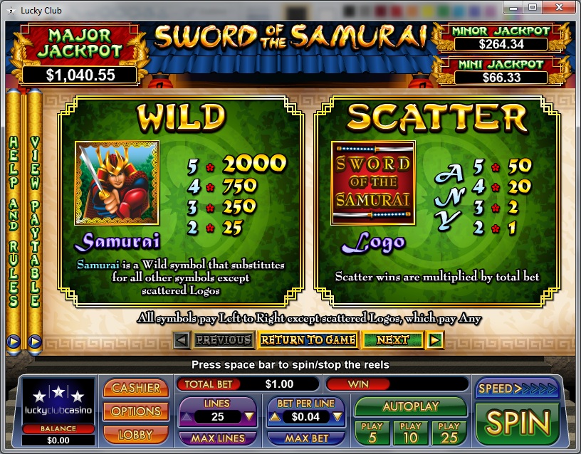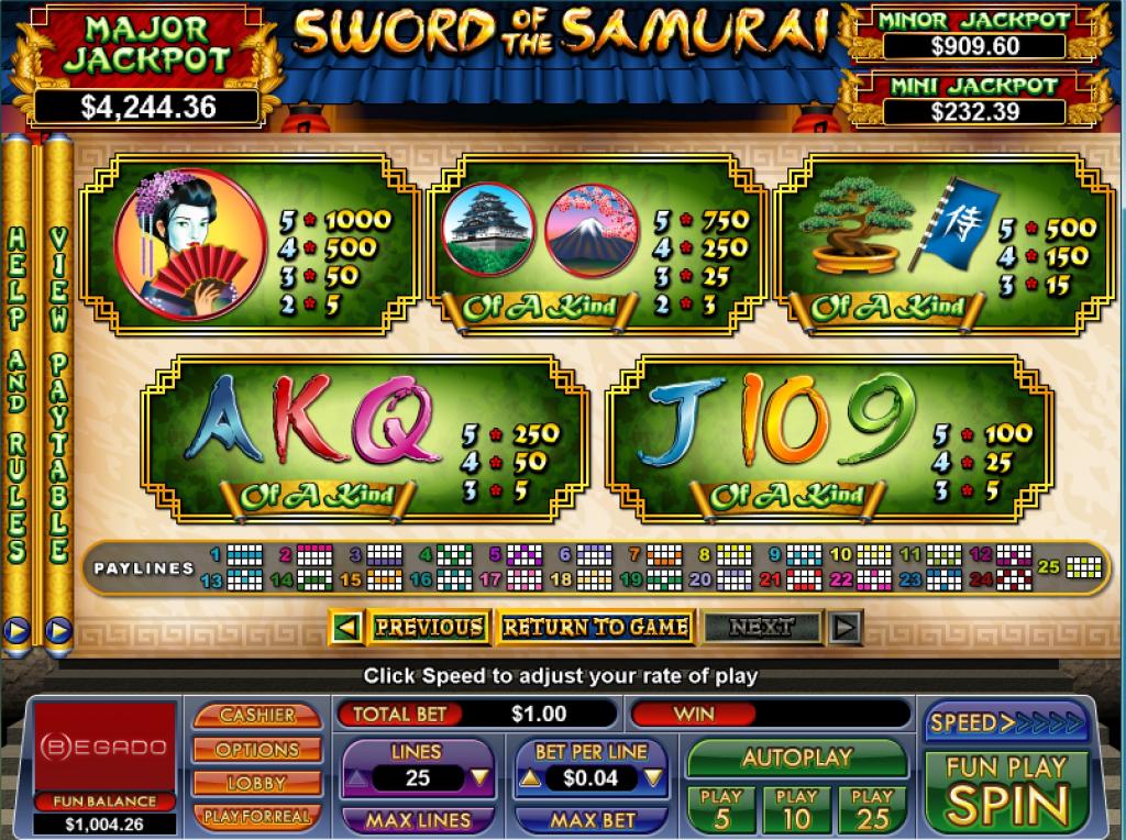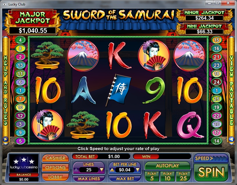 Sword of the Samurai was designed by Nuworks, a slot developer which has quite a few very well designed games, with superior graphics and all the right features available in one place. This is one of their better games, the Japanese Samurai theme being well thought out, plus there are some progressive jackpots also awarded at random. There are more than enough Samurai or Japanese inspired slots already, but I can’t say that Nuworks shouldn’t have made yet another one. On the contrary, it’s good enough to give the existing ones some powerful competition.