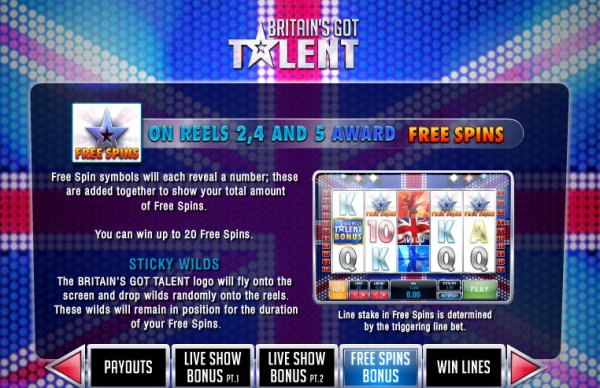 Check out the list of features from Britain’s Got Talent, and on it you will find wild symbols, bonus games, scatters and free spins.