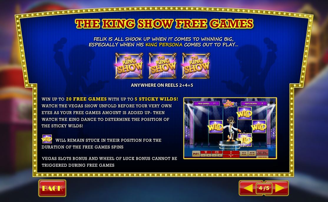 When you see the King Show Logo on the 2nd, 4th and 5th reels, during the same round, you can expect to be offered the free games feature next.