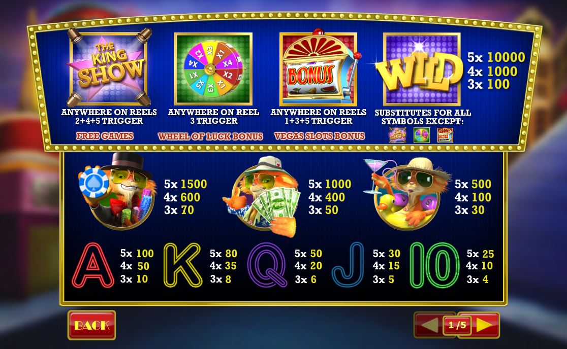 Symbols: King Show Logo (scatter), Wheel of Luck (scatter), Slot Machine (scatter), Wild Logo (wild, 10,000 coins), Felix holding chips (1,500 coins), Felix holding cash (1,000 coins), Felix drinking a cocktail (500 coins), Ace (100 coins), King (80 coins), Queen (50 coins), Jack (30 coins) and 10 (25 coins).