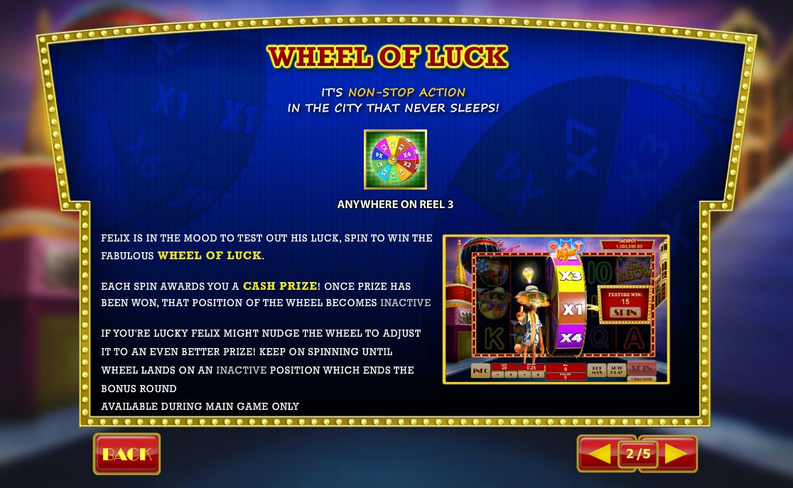 Felix shows up, next to the Wheel of Luck, and he asks you to click on the Spin button. You get a small prize each time you spin the wheel, which offers you up to 5x the bet. Once you’ve landed on a position and you get its prize, that part becomes inactive. You continue to spin the Wheel of Luck until you get one of these inactive positions that already paid you.