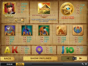 The first of the scatter symbols is a gold coin with the Eye of Ra on it. Its only role in the game is to offer prizes, in the form of total bet multiples. They start at the value of a single total bet, when you have two scattered symbols, and goes up from there. It can reach a top value of 125 times the bet.