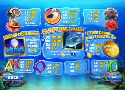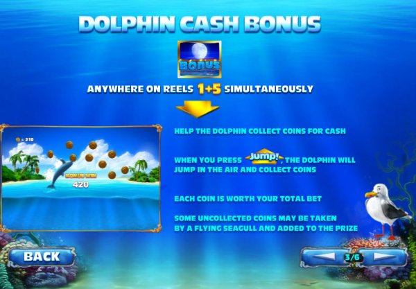 The bonus game shows you a dolphin swimming in the water, with gold coins being in the air above him. You click on Jump and at that point the dolphin does just that, collecting gold coins for you. With each coin you take, you get a prize worth the same as the total bet.