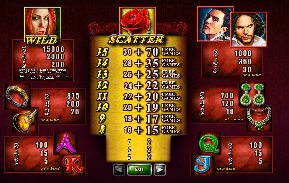 Symbols: Esmeralda (15,000 coins, wild), Red Rose (30x the bet, scatter), Man black shirt (1,000 coins), Man white shirt (1,000 coins), Tambourine (875 coins), Guitar (875 coins), Earrings (700 coins), Necklace (700 coins), Ace (100 coins), King (100 coins), Queen (100 coins) and Jack (100 coins).