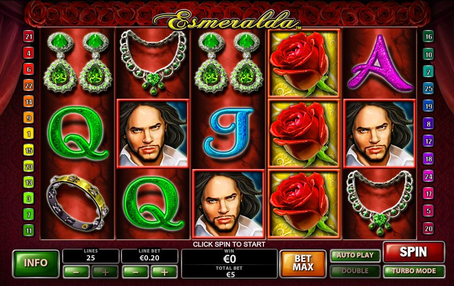 EsmeraldaEsmeralda is a game which is themed around a beautiful Spanish woman. Dancing and singing are two things that have a lot to do with this movie, a fitting choice for a game that seems to want to celebrate the Latin heritage. It is a game which is offered by Playtech and it does well both feature and design wise.