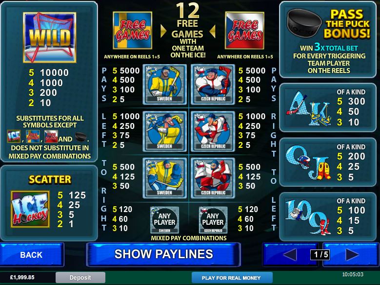 The scatter symbol that’s easiest to explain has an Ice Hockey Logo on it, and its only role seems to be that of a trigger for certain cash prizes, which will take the number of scatters into consideration, and then it will pay between 1 and 125 times the bet value.