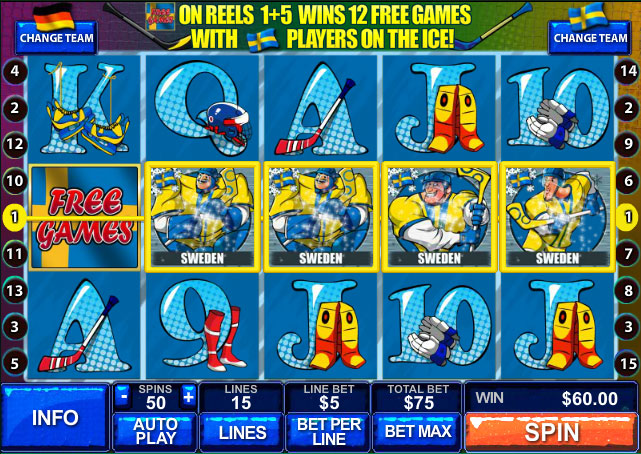 You start off the game with the choice of the two teams that will face each other in the game. The seven teams from which you can choose are USA, Czech Republic, Germany, Russia, Canada, Sweden and Finland. The first team’s symbols will pay from left to right, while the second team offers prize when the combinations with its symbols start from the rightmost position and go to the left. Three players are placed on the reels from each of the two teams.