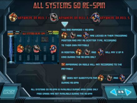 The three types of Iron Man symbols which the game has can trigger their own feature, this Re-Spin. You need Iron Man on the 1st reel, the Black Iron Man on the 3rd reel and the Blue Iron Man on the 5th. If all three symbols are where they’re needed, a single re-spin is awarded, with the three staying where they landed initially and paying as scatters would. The wilds can’t replace Iron Man symbols during this re-spin.