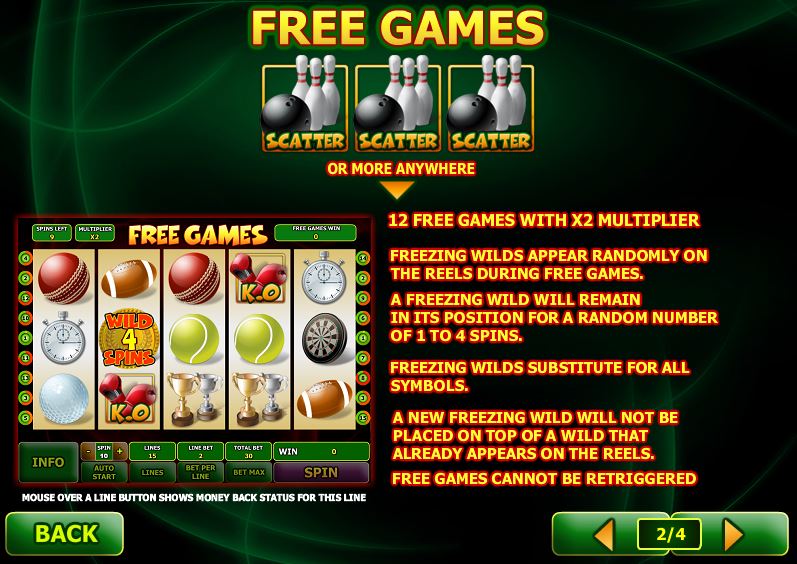 You can get more than just prizes when the scattered Bowling icons are present. The same 3+ icons will start up the free spins, 12 rounds being offered, while their wins are worth double thanks to a multiplier. You get frozen wilds as well, symbols which will stay in place when they appear for 1 to 4 rounds.