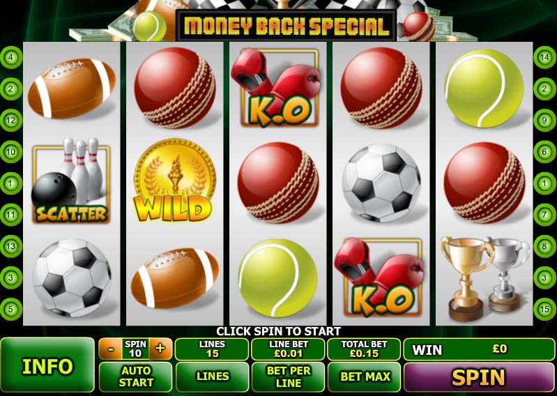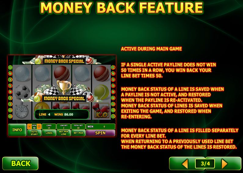 Money-Back-SpecialComing from Playtech, Money Back Special is a game themed around various sports, the main idea being that if you don’t win at least once in 50 spins, then you get some of the money back. It’s far from an impressive feature, since it doesn’t give you much when it activates. Still, the game can be a decent way of spending some time, mostly because of the pleasant design which you can rely on to keep you entertained for a while. There isn’t one specific sport that is covered here, instead being about them all in general, including football, tennis, boxing, darts, golf and so on.