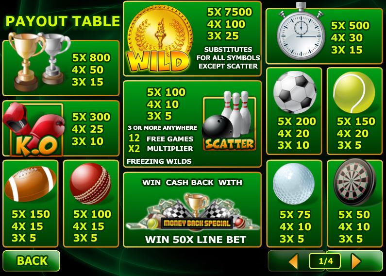 Symbols: Gold Medal (7,500 coins, wild), Bowling (100x bet, scatter), Trophies (800 coins), Chronometer (500 coins), Boxing (300 coins), Football (200 coins), Tennis Ball (150 coins), American Football (150 coins), Red Ball (100 coins), Golf Ball (75 coins) and Darts (50 coins).