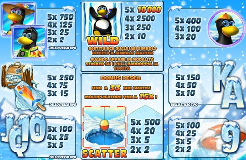 Symbols: Sliding Penguin (wild, 10,000x), Fishing Hole (scatter, 500 times the bet), Dad Penguin (750x), Mom Penguin (750x), Penguin Boy (400x), Luggage (250x), Fish on stick (250x), Ace (150x), King (150x), Queen (100x), Jack (100x), Ten (100x) and Nine (100x).