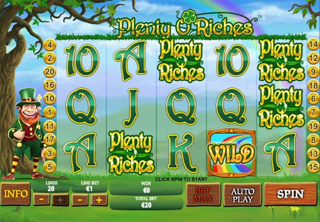 Symbols: Wild Rainbow (wild, 500 coins), Wishing Well (scatter), Pot of Gold (scatter), Leprechaun (scatter), Plenty o Riches Logo (250 coins), Ace (150 coins), King (150 coins), Queen (100 coins), Jack (100 coins) and 10 (100 coins).