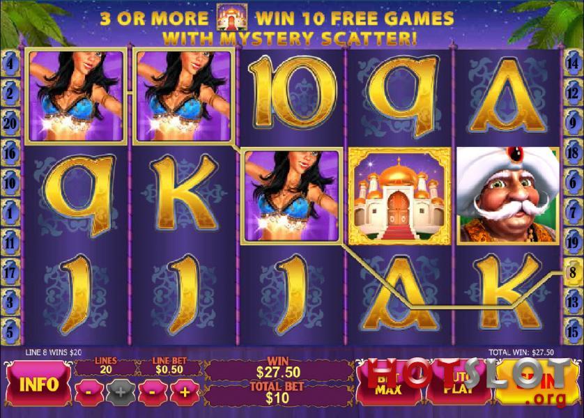 Having 3+ scattered Sultan’s Palace symbols gets you access to the 10 free spins and to a mystery scatter. One of the regular icons is chosen to act as the mystery scatter for the duration of the free spins. It’s picked at random, and if you have enough of those icons present somewhere on the reels you will get paid. The best part about it, it uses the original value, but multiplies it by the total bet, not the line bet.