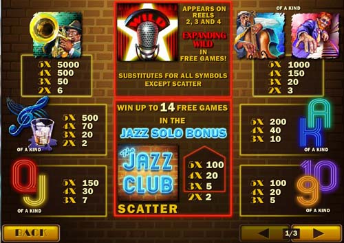 Symbols: Microphone (wild), The Jazz Club Sign (scatter, 100x the wager), Trumpet Player (5,000 coins), Jazz Bass Player (1,000 coins), Piano Player (1,000 coins), Musical Note (500 coins), Whiskey Glass (500 coins), Ace (200 coins), King (200 coins), Queen (150 coins), Jack (150 coins), 10 (100 coins) and a 9 (100 coins).