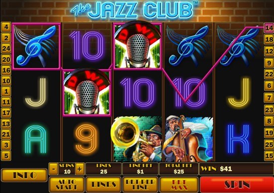 25 lines are available in The Jazz Club, a 5 reel slot machine. The slot has payouts of up to $50,000, scatter symbols, free spins, multipliers and wilds which can even expand in certain situations.