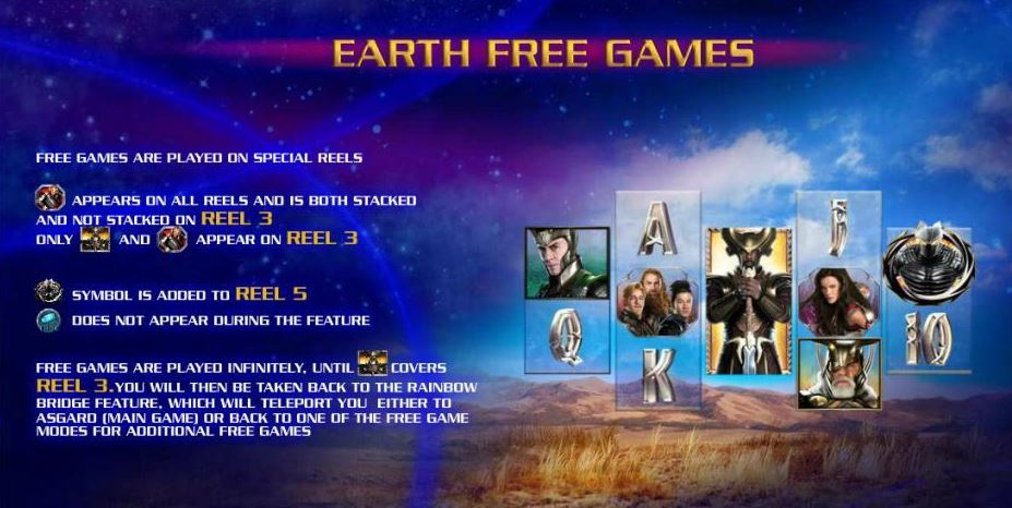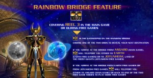 The Earth free games are also played until you get a Gatekeeper covering the 3rd reel completely. That 3rd reel has only two types of symbols, the Gatekeeper and the Thor wild. If you do get the Gatekeeper to cover the reel, the feature takes you to the Rainbow Bridge, and you can either get back into the free spins, or you can end the bonus feature.