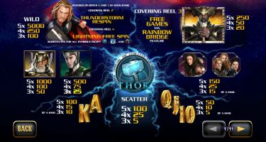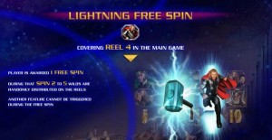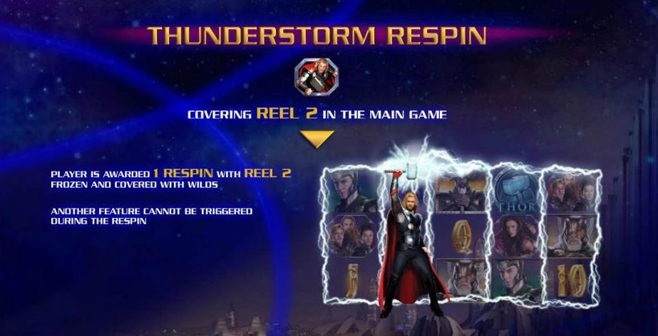 Whenever the Thor stacked wild occupies the 2nd reel in the main game, the result will be the Thunderstorm Respin. The 2nd reel gets covered entirely by wilds, while the other four reels will respin once for free.