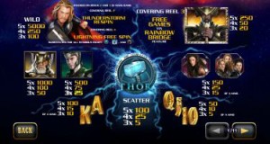 Symbols: Thor (wild, 5,000 coins), Gatekeeper (250x the bet, scatter), Odin (1,000 coins), Loki (500 coins), Female Warrior (150 coins), Warriors Three (150 coins), Ace (100 coins), King (100 coins), Queen (50 coins), Jack (50 coins) and 10 (50 coins).