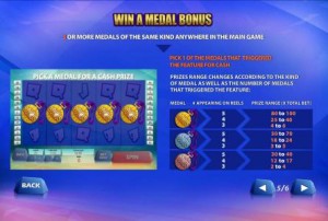 The game has three types of bonus symbols with medals in them. It’s obviously going to be a gold, a silver and a bronze medal. Three identical medals have to appear scattered on the reels, in order for the Win a Medal feature to start. You are asked to pick one medal out of the ones that triggered this feature. Depending on the type of medal and the number of triggering symbols, the prize will vary.