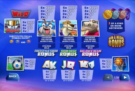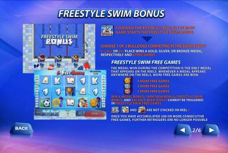 If you get the Bulldog symbol stacked over the entire 3rd reel, the result will be a bonus game called Freestyle Swim. A bonus game starts with a swimming event in it, where you pick one of the three competitors. Depending on which place your chosen bulldog finishes on, you win a medal and 8 free spins. The medal you won will be the only bonus symbol present during the free spins.