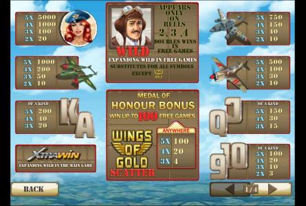 Symbols: Fighter Pilot (wild), Wings of Gold Logo (scatter, 100x the wager), Pin-up Girl (5,000 coins), Green Bomber (1,000 coins), Blue Bomber (750 coins), Fighter Plane (500 coins), Ace (200 coins), King (200 coins), Queen (150 coins), Jack (150 coins), 10 (100 coins) and 9 (100 coins).